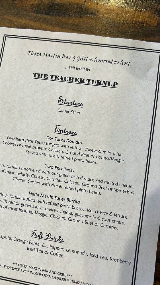 Welcome to Fiesta Martin Bar & Grill, a vibrant Mexican restaurant located in Inglewood, California. This Latinx and women-owned establishment offers a lively atmosphere, delicious food, and a variety of amenities to enhance your dining experience. With a menu featuring Fish Specialties like Baja Fish Tacos Combo and Chicken Specialties like Dos Chicken Chimiflautas, there is something for everyone to enjoy.